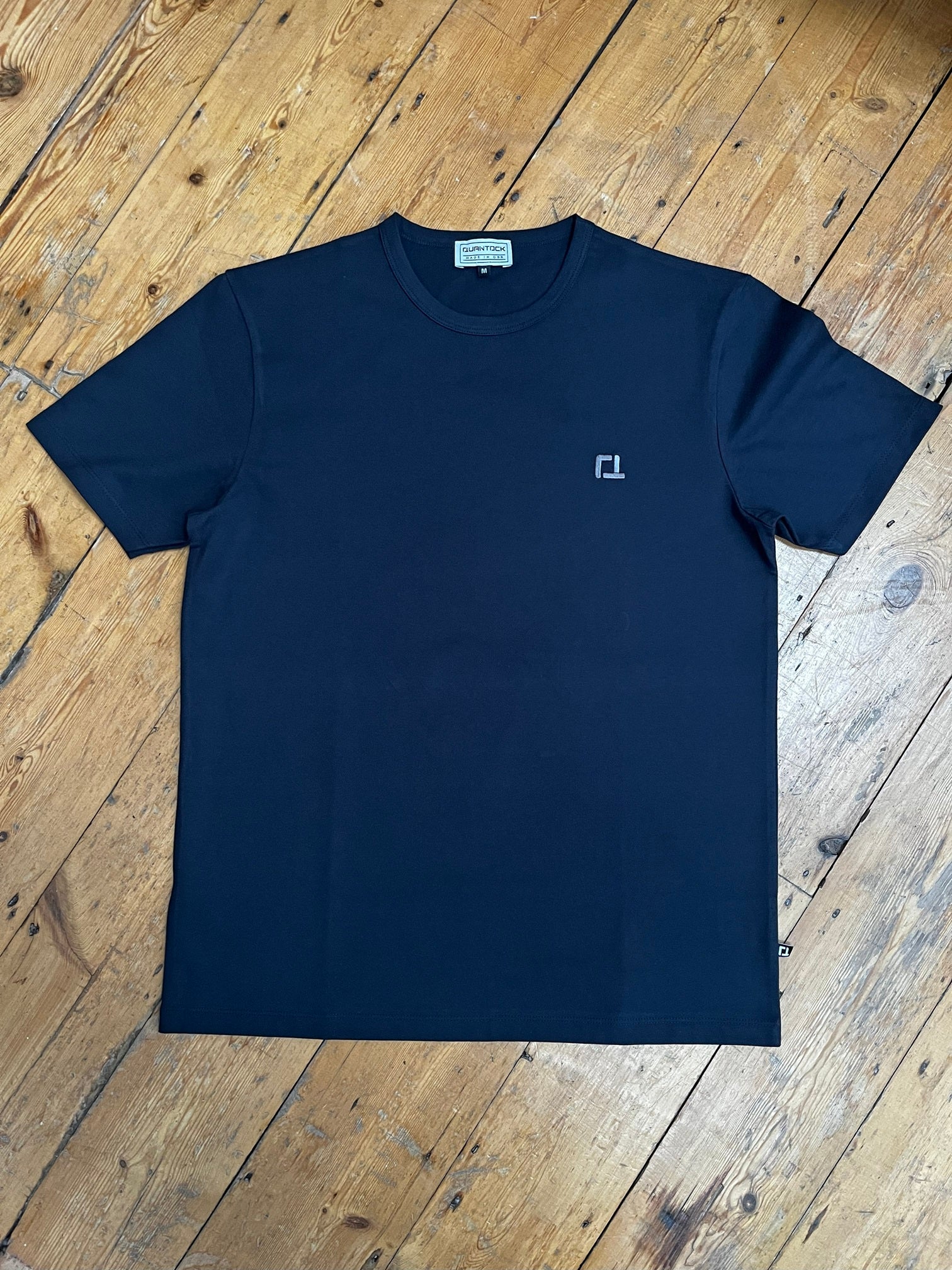 The timeless navy blue T shirt featuring our embroidered Quantock "Q" logo in grey stitching and our Q tag on the right seem.